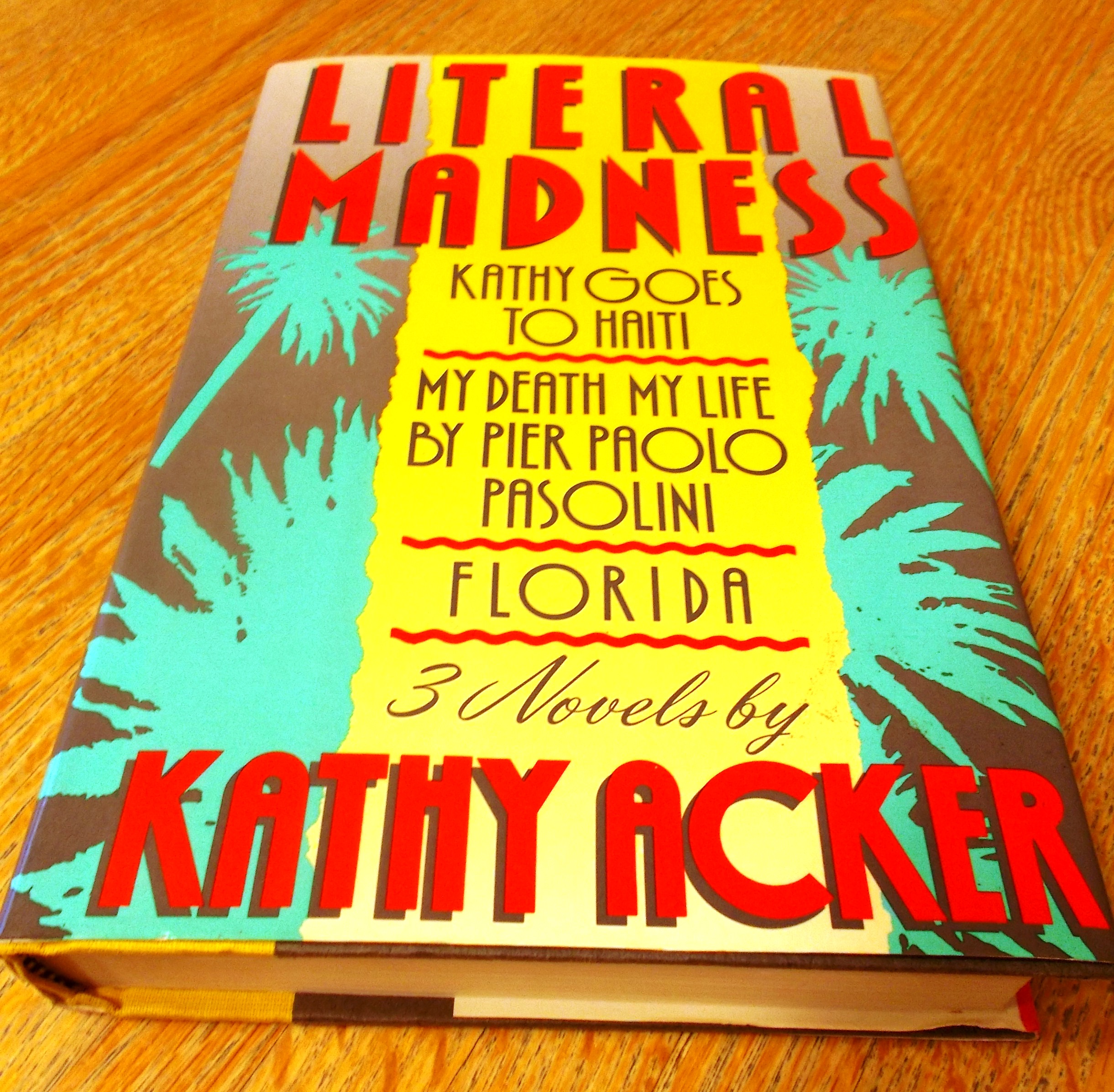 Back to the title in question. Yes, I was surprised to find it, but not only because I found it in a state where Kathy Acker isn’t exactly widely read (nonetheless, well-read literary deviants populate every corner of the world, you know). Rather, I was surprised because the dust jacket blended in so well with the other books where it was stacked with genre fiction consisting primarily of brightly jacketed romance novels. At first glance, I mistook it for an early Carl Hiassen book, one of his Miami mysteries, palm trees and all, and Florida, the third title on the jacket, didn’t help. I thought, “oh, Kathy Acker – she must write cheap genre fiction.” But Pasolini’s name jumped out at me from the jumble of type and I immediately realized it was a relatively rare copy of a work by the Kathy Acker.