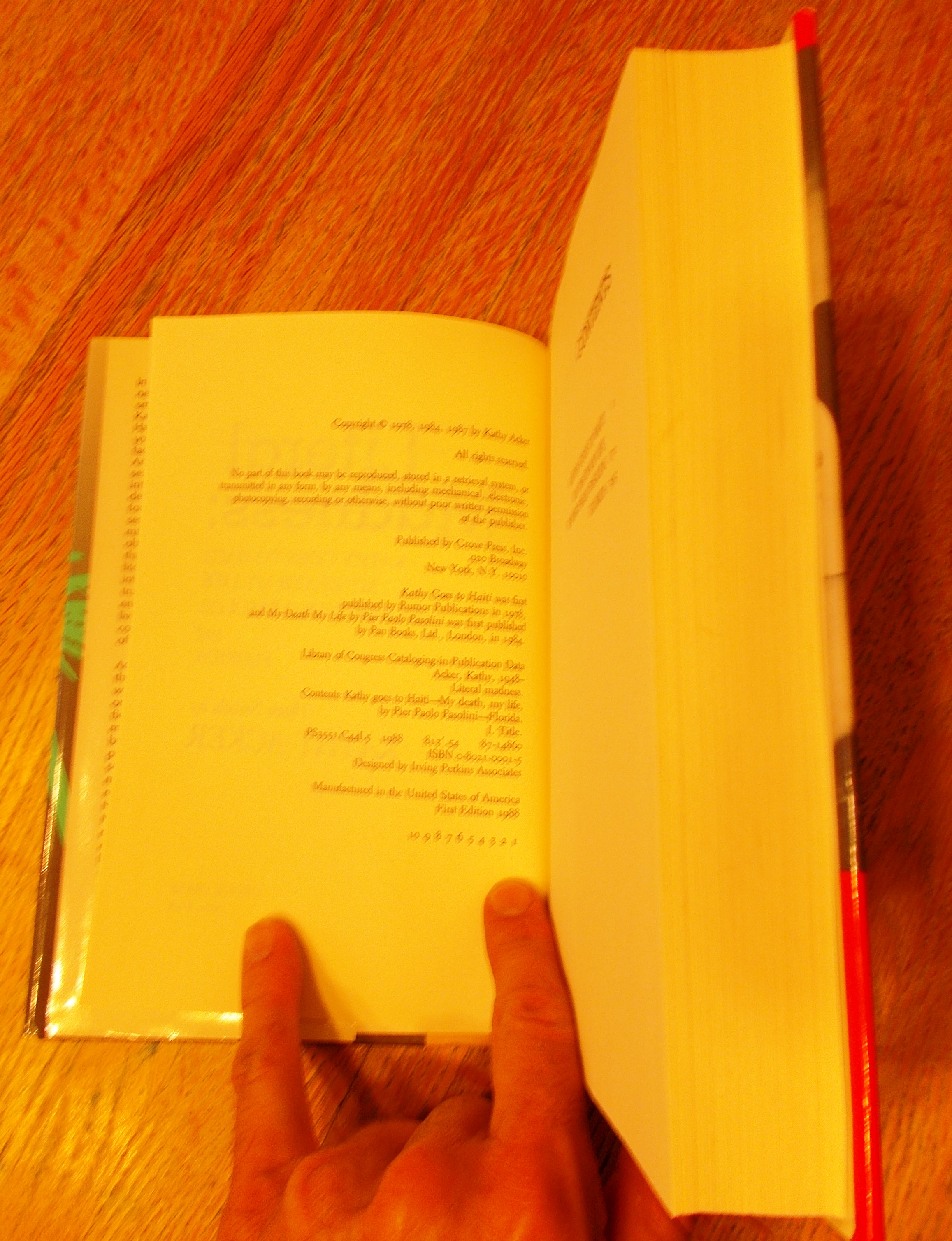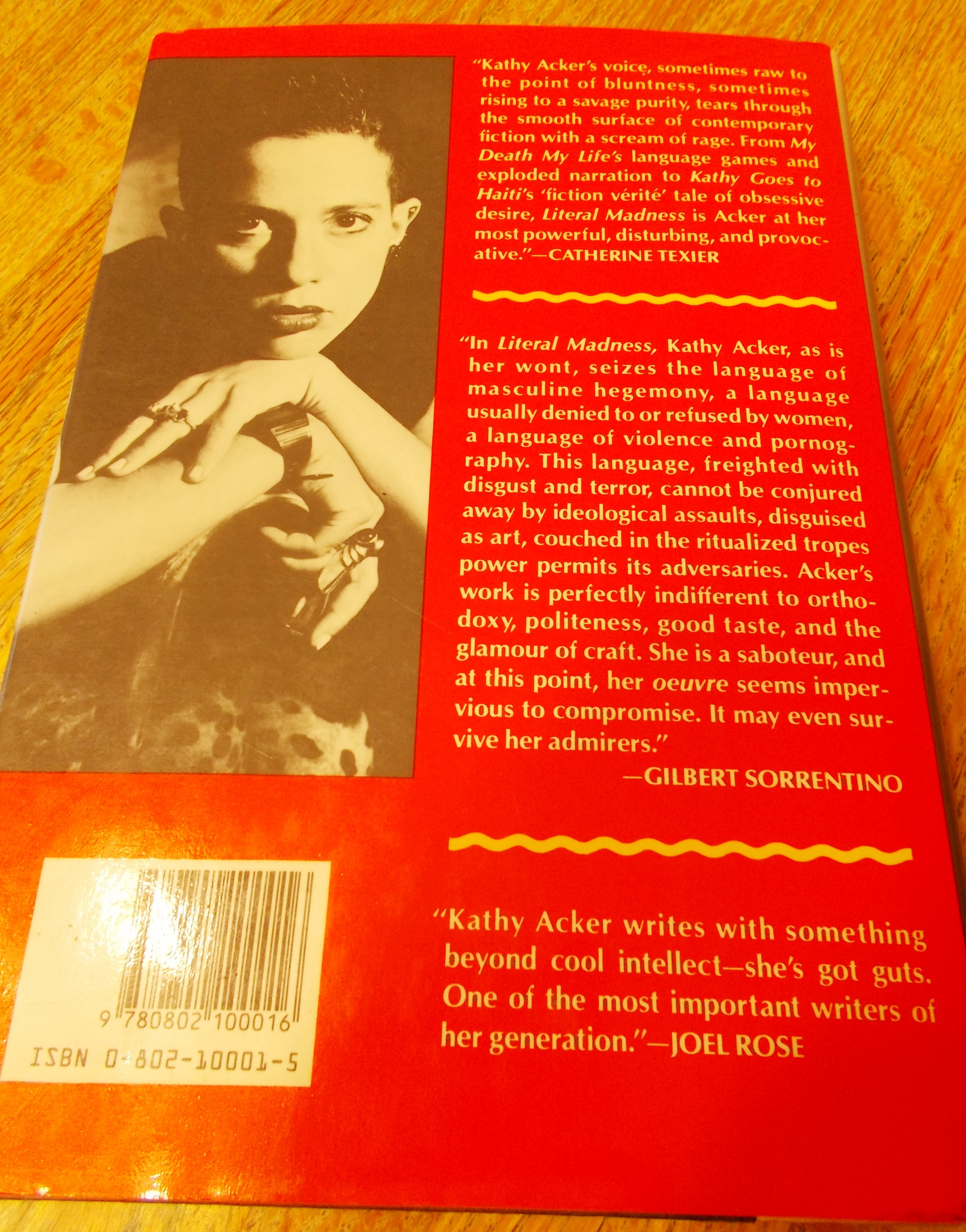 Aesthetics – there is much of it in the materiality of collecting books. The tasteless dust jacket aside, the good folks at the religious charity thrift shop did put out a nice copy of the 1st edition of Literal Madness. It has only very light shelf wear, no sticker marks, and a bright (too bright?), intact dust jacket. The binding is tight; the pages are clean and without sun fading or dust spotting. In all, it’s a really nice find for my collection at only $1.49. Grove keeps a paperback edition of Literal Madness in print, the design of which is mercifully consistent with other Grove titles by Acker.