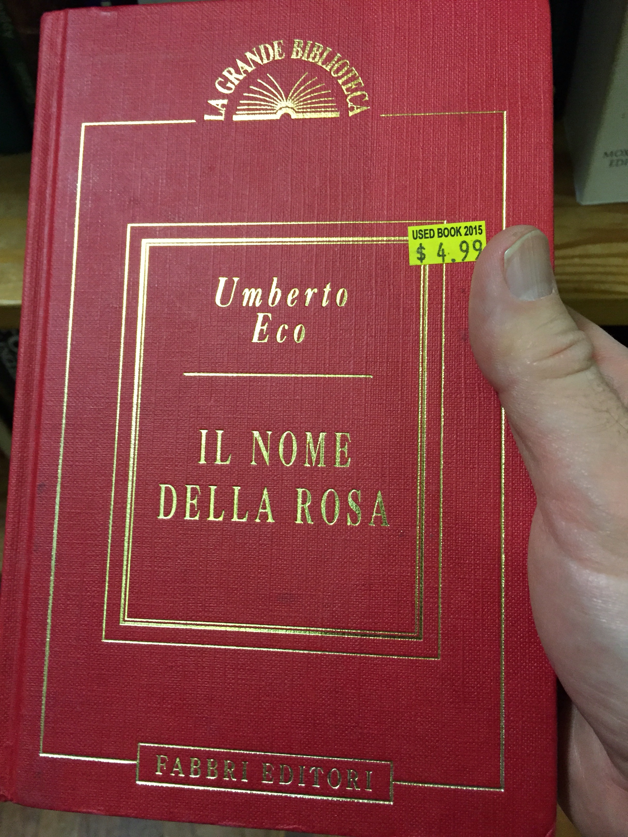 The edition of The Name of the Rose by Eco was new to me. The publisher appears to be a book club or reprint house, with a printing date in the mid-90’s, but is in actuality a publisher known for its textbook lists. This was a nicely bound copy, in excellent condition, suggesting a curious bibliographic footnote to the publishing history of one of the late 20th centuries most important novels. A book for the completist, I would imagine, and at a very good price.