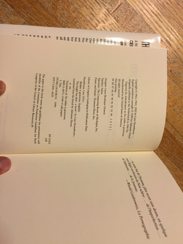 What is bad for the market is of course good for the scavenger, and I have been fortunate enough to come across several fine copies of Nooteboom’s works, including a rare signed U.S. 1st edition of The Following Story. One immediately notes that, as if to confirm Coetzee’s insult, these are slim texts, designed for easy portability (in fact, the previous owner of my copy of The Following Story left her plane ticket – the literary traveler’s bookmark – in the book). Perhaps the slender form imparts to the books a disposability; after all, we treasure density, length and weight – so-called maximalist fiction has generally dominated the contemporary markets.